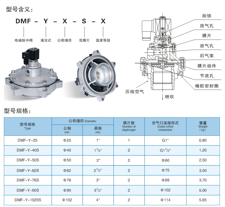 DMF-Y型電磁脈沖閥為淹沒(méi)式閥(亦稱(chēng)嵌入式閥),它直接安裝在分氣箱上,具有更好的流通特性。壓力損失有所下降,適合于氣源壓力較低的工作場(chǎng)合。