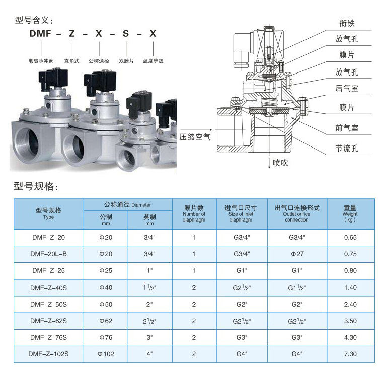 DMF-Z型電磁脈沖閥為直角式電磁脈沖閥,其進出口之間的夾角為90度,適合于氣包與除塵器噴吹管的安裝連接。氣流暢通,能提供復合要求的清灰氣脈沖。