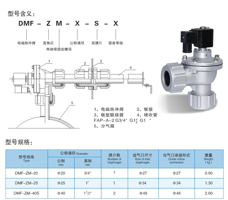 DMF-ZM型電磁脈沖閥:是與“Z”系列相同的直角閥,適用于氣包與除塵器噴吹管的安裝連接,其進出口二端帶有安裝用的固定螺母,使安裝和使用更為方便。